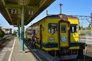 From Taga-taisha-mae station, head toward Seri river. While riding along Seri river, we found a stone structure called “Nakagawara, the home of the Naumann elephant. This is because a fossil of a Naumann elephant was discovered on the riverbank of Seri river.