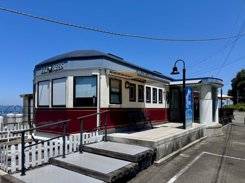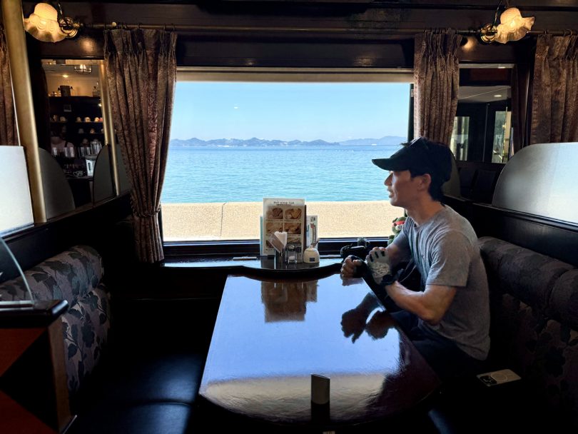 Continuing south along the national highway, you’ll find the ‘Cafe Train’ appearing by the sea.