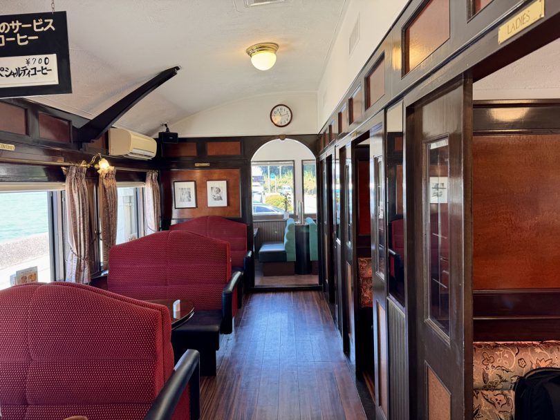 Enjoy delicious coffee while gazing at the beautiful sea from the nostalgic, luxury train-like interior (carriage windows).
