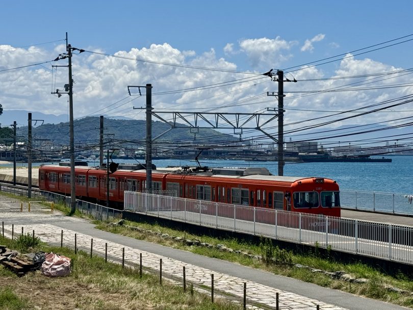 From the second floor, you can look out over the Iyotetsu ‘Baishinji Station’ and the sea.