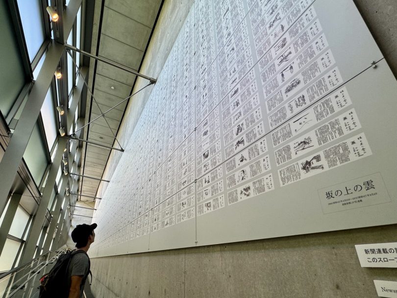 The slope connecting the third and fourth floors displays the entire serialized novel “Clouds Above the Hill”, which ran in the Sankei Shimbun (evening edition) for approximately four and a half years from 1968, spanning 1,296 installments, covering an entire wall.