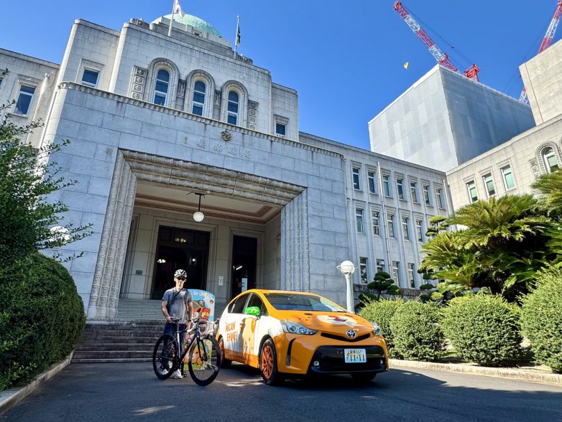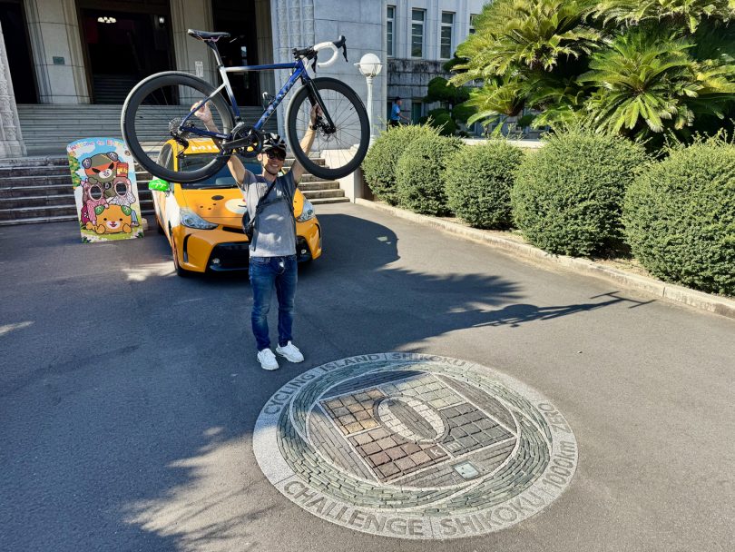 Stopping by the Ehime Prefectural Government Office, head to the “Shikoku Cycle Tour Start” monument in front of the main building, the “Shikoku Cycle Tour 0km Monument”.
